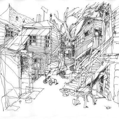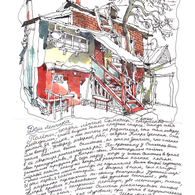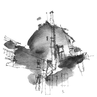 Пятно акварелью или тушью может стать первой стадией изображения дома;